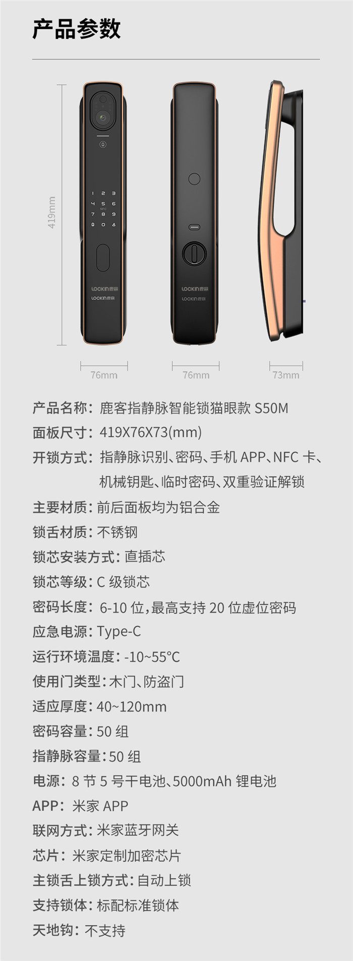 鹿客指静脉智能锁猫眼款S50M怎么样呢?一起来看看实际的使用体验:【金测评】老家旧门换新锁,我给父母换了鹿客S50M指静脉智能锁【金测评】指纹锁已OUT?指静脉更安全——鹿客指静脉智能锁猫眼款S50M使用报告【金测评】指静脉解锁新科技!鹿客S50M让开门精度大提升!【金测评】老人小孩都可以用,指静脉识别+猫眼可视鹿客S50M智能锁【金测评】指纹锁被淘汰,指静脉秒开?鹿客S50M智能锁体验
