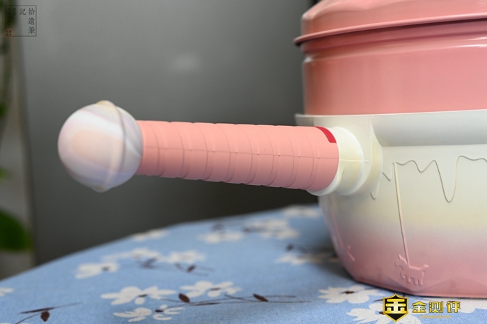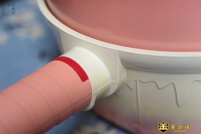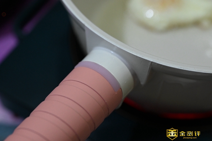 此外在手柄的位置,则是采用了一种棒棒糖的设计,看上去十分好看,而且手感也很细腻,另外作为一款导热能力很强的锅具,这款奶锅手柄和锅身接触的位置,还加上了一个可以变色的感温键,温度达到45℃就会开始变白,达到140℃就变成粉白色,日常使用时可以很直观的看到当前的锅身的温度区间,加上手柄位置还有一个隐蔽式的挡火条设计,这样除了能避免被烫到之外,还可以防止手柄发黑。