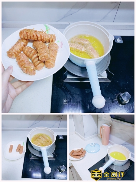 然后把锅里的水倒掉,加入食用油,煮开,油开始冒泡的状态,就可以把划好刀的烤肠逐个放入油锅。