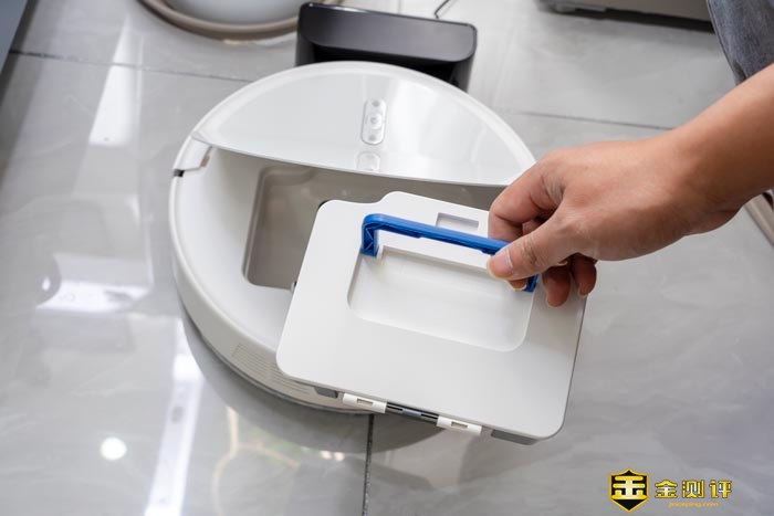 然后就是更换尘盒里的尘袋,丢掉一次性尘袋后,装入刚刚装好的水箱,再安装进入扫地机即可准备好拖地的准备工序。