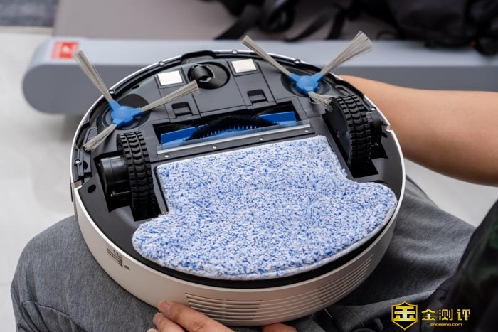 从底部来看的话,感觉扫地机也都是这样的设计,差别不大。底部的这个蓝色的中刷是可以更换的,特别针对宠物家庭设计,能高效的清除地面毛发,是一个防缠绕的软胶中刷,在清除地面毛发的时候可以有效避免被缠绕。如果毛发多的话用这个会效果更好一些。在使用前需要自己把拖布的魔术贴安装好,再把拖布安装好,这时候就可以开始下地工作了。