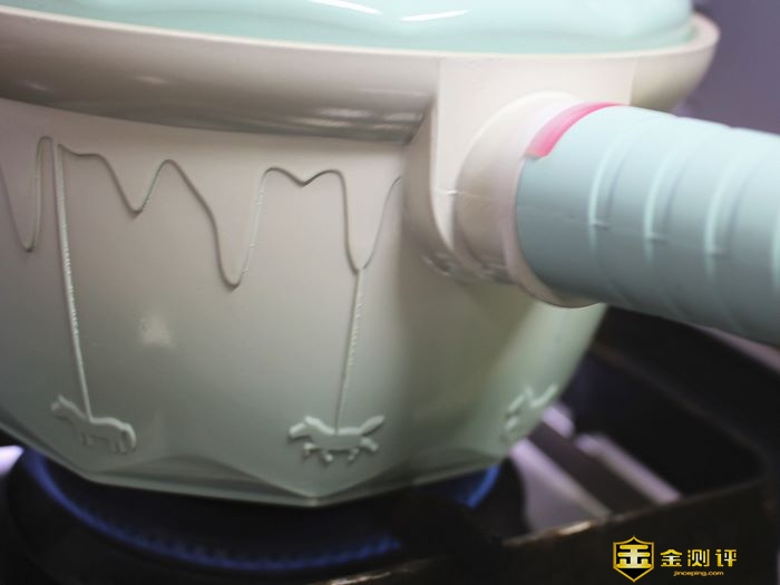 比较喜欢的设计是在锅柄和锅身连接处,多了一个感温条,双段感温,温度45°左右的时候,感温条开始变白,140°左右会变成粉白色。方便控温,不过感觉更适合油炸或者炒菜的时候使用,可以了解油温,不用再单独放置探针了。