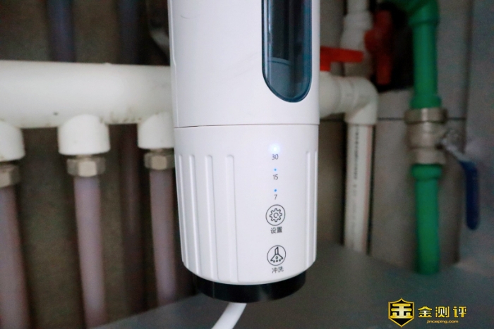 特洁恩AS16前置过滤器有两个按键,上面是设置定期冲洗的时间的,下面的是冲洗键,按一下就开始冲洗再按一下则暂停。