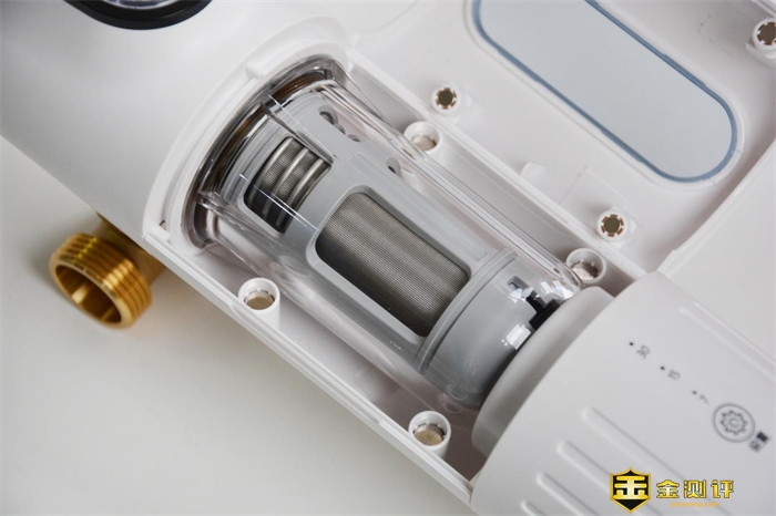 轻轻打开这部分外壳,里面是高分子航空防爆滤瓶,它采用食品级加厚滤芯材质,能抗严寒、抗压力、抗水锤冲击,安全性很高。防爆滤瓶里面的316不锈钢双滤网也看的很清楚,40μm精度能高效滤除水中的铁锈、泥沙、虫卵等,且不易堵塞。