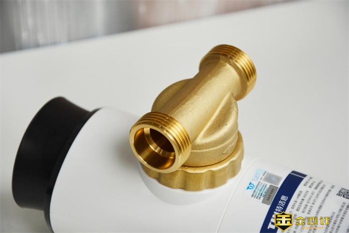 圆柱机身的背面,上方是360度万向铜阀头。它采用安全无毒的环保无铅铜材质,充分保障了饮用水经过时的健康、安全问题,同时也有良好的耐腐蚀、稳定性能,不容易生锈、能承受冷热压力,经久耐用有品质。另外,这个阀头支持万向调节,360度自由旋转,好处当然就很明显了,可以横向安装、竖向安装、倾斜安装都不在话下,在不破坏水表、水管等前提下全面适应空间小、多角度安装的复杂环境。