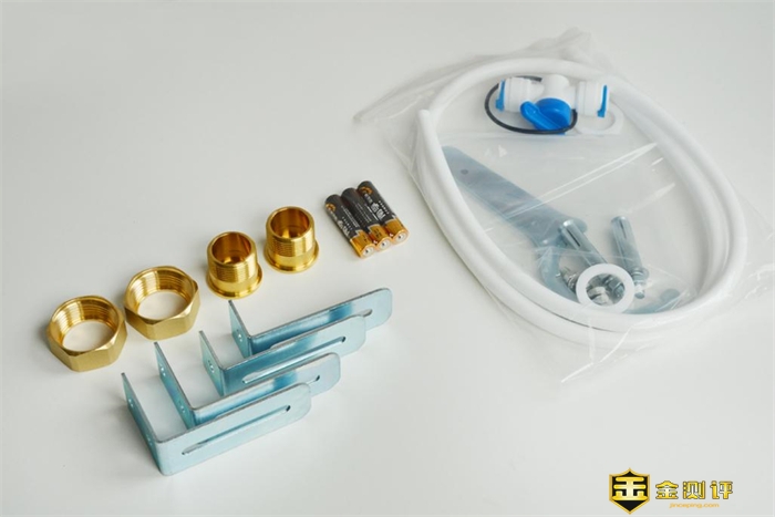 里面包含有特洁恩前置过滤器AS16和一众安装配件,具体有长支架两个、短支架两个、M6膨胀螺栓、M6螺栓、转接头及垫片、七号电池三节、密封圈、PE三分硬管、专用扳手。