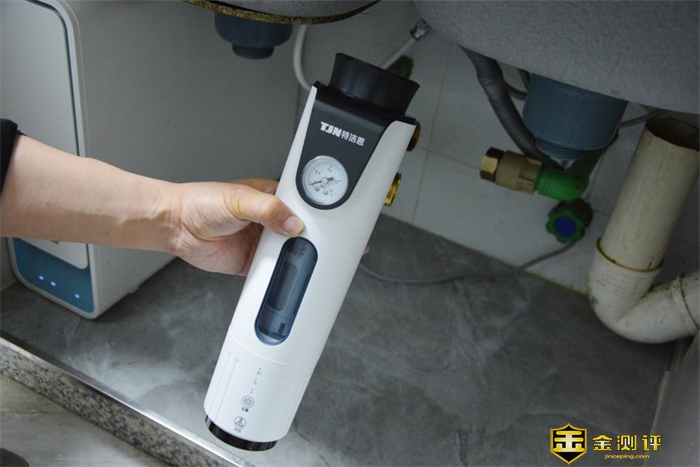 压力表下方是一个椭圆形的茶色放大镜,一来茶色可以避免阳光直射,保护滤瓶不长青苔,二来它也可以轻松观察过滤状态,让用户更加放心。