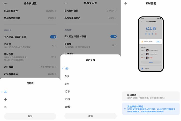 除了主动查看,鹿客S50M的猫眼还能够提供智能猫眼的侦测功能。可以在有人经过、逗留时自动录像;提供了高、中、低三个侦测灵敏度档位,可以选择最适合自己习惯以及居住环境的;录像可以进行1-30s的延时设置;实时画面提供了两种不同的选项:实时直播与事件直播。