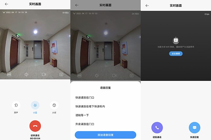 鹿客S50M支持两种访客沟通方式,使用感觉类似于家庭的入户电话,不过入户电话支持的是单元入户,而鹿客的猫眼支持的是住户门口的沟通。鹿客S50M提供了单向直通视频电话,为了防止因为是女性回答而引起不必要的危险,提供了原声、小丑、大叔三种语音效果。如果你觉得没必要可以看看我开篇提到的《门锁》这部电影,看过后你会觉得这个功能对单身女性/独居老人的重要性。而其他的日常面对的人员,比如快递、外卖等,鹿客S50M提供了四种通用的快捷回复。