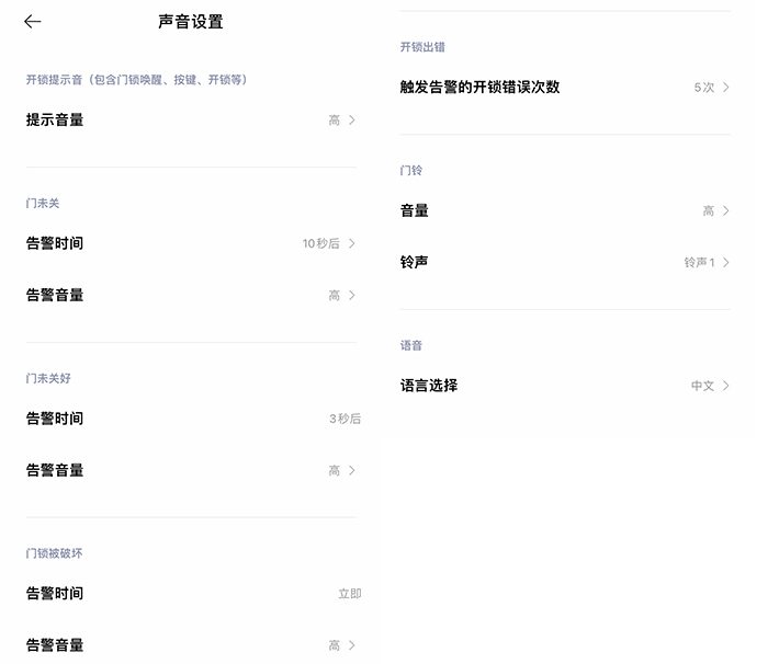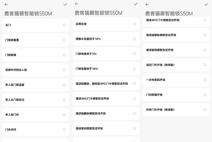 针对此类问题,鹿客S50M提供了多种情况的提醒功能:开锁提示音、门未关、门未关好、门锁被破坏、开锁出错、门铃、语言选择。在间隔时间和音量上都可以自主选择。