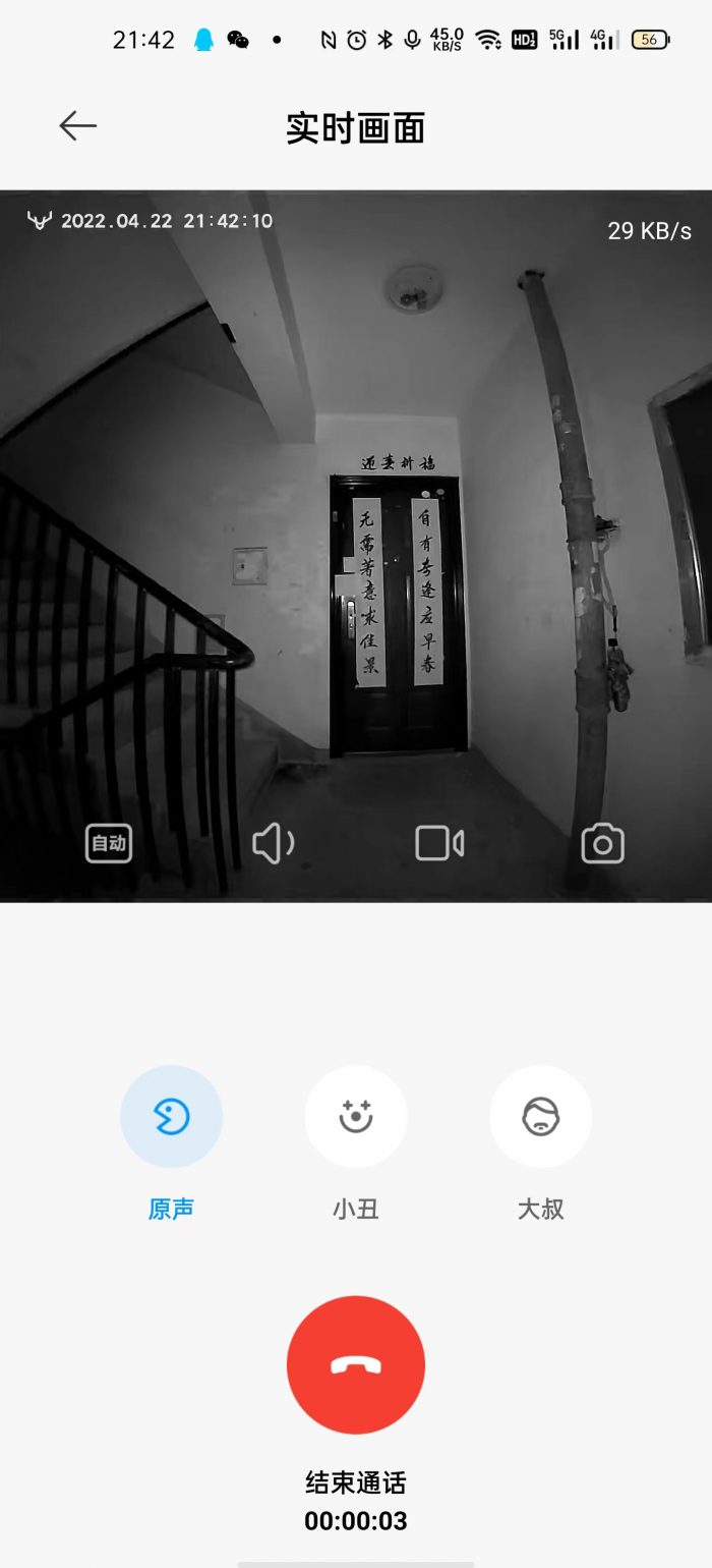 APP可以调节变声通话,当独居女性一人在家时,可以通过变声功能与门外人员进行通话,有大叔和小丑声音可选,私密性更好,安全更有保障。