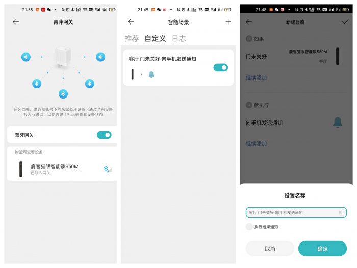 蜡笔手头是青萍网关,折腾一番安装到位后,在门锁中设置智能场景即可实现远程控制和联动。