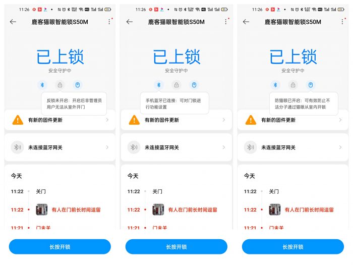 APP后台首页展示门锁上锁与未上锁状态(开启蓝牙后),并在下方以小表显示蓝牙状态、繁琐状态和防猫眼状态,非常直观。