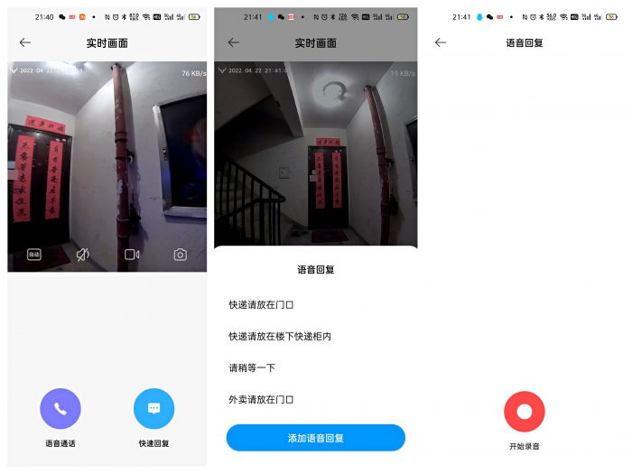 除了实时语音,也可以快速回复,有“快递请放门口”等已有的选项外,还可以另行根据需求进行专属语音回复的录制。