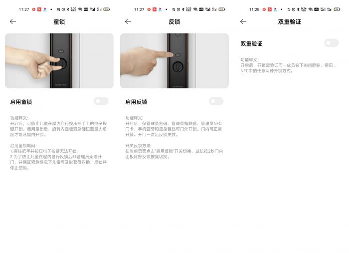 APP上会有各项功能的设置和使用说明,包括童锁的使用、反锁的使用、多重验证开门的使用等。