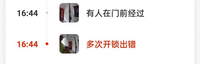 门锁日志是图文并茂的,既有纯文字+时间轴的状态记录,并根据紧急与否用红色、黄色、黑色等不同颜色字体呈现在App端列表上。门锁日志支持动态保存6天,累计144小时。