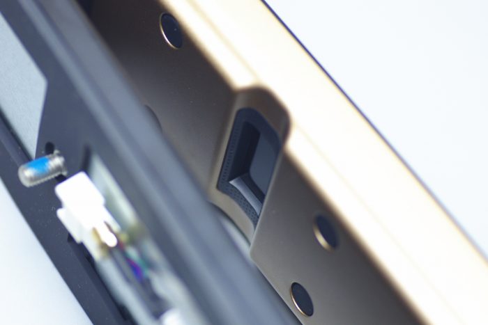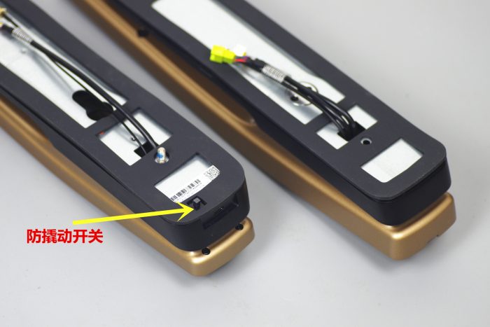 面板背后带有橡胶垫,安装的时候起到缓冲作用,避免锁体背面和房门表面摩擦刮花,还可以防尘防滑。内外两个面板都有线材延伸出来。另外,外侧面板靠近底部的位置有一个防撬动开关,安装好以后开关自然被压下,如果发生撬动开关弹起就会自动向主人的手机APP推送报警信息。