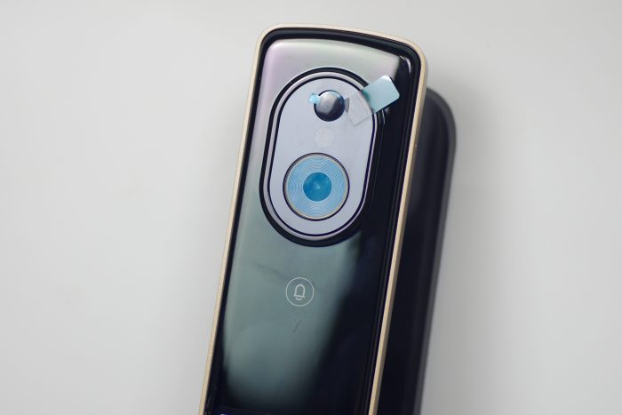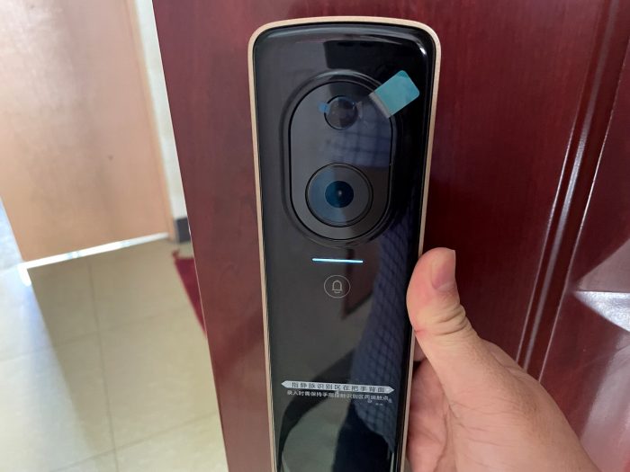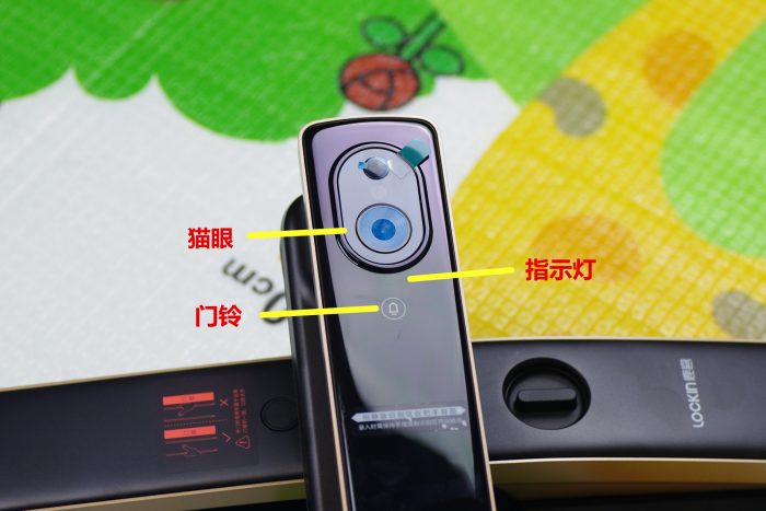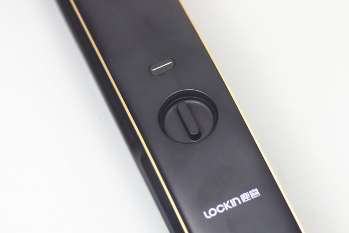 在摄像头下方是一个长条指示灯和门铃按钮,解锁验证成功指示灯会亮起3秒白光,闪两次红光表示解锁验证失败,还挺直观的。