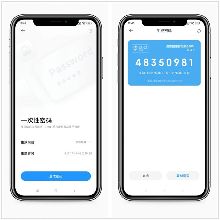 之前用的旧指纹锁使用临时性密码需要手机连接蓝牙门锁才能实现,而鹿客S50M智能锁可以通过米家APP远程下发一次性密码,并且可以设定密码有效时间段,过期后自动失效。对于临时朋友来访或者家里的保洁阿姨这一些特殊情况,就显得方便很多了,既不用担心常用密码的外泄问题,也很好的解决开门的需求。