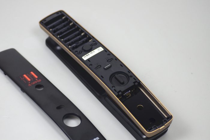 室内面板的黑色盖板部分是可以整个拿下来的,揭开以后最上方是五号电池仓,主要为门锁功能供电,可续航12个月,中间区域还有功能键和重置键两颗实体按键,而最下方的是猫眼锂电池仓位,5000mAh的锂电池5~8个月充一次即可。双电池供电优势就是即便猫眼电池没电的情况下也不影响门锁正常使用,大大提升了门锁续航能力。