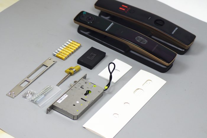 配件全家福,包含有内/外两个面板、防夹装饰板、锁体、导向片、8节五号电池、锂电池、锁芯、机械钥匙、安装螺丝包和使用指南。
