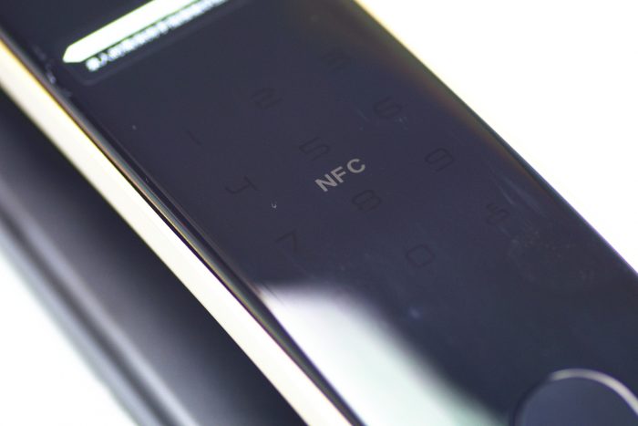 面板中间是NFC卡片识别区域,标记有NFC字样。同时,这个部分还有隐藏式密码键盘,默认平时是不显示的,一体性很强,需要输入密码的时候轻触面板,数字键盘即亮起,数字键带有背光灯。再靠下的椭圆形盖板是机械钥匙孔盖板,用力按下半部分就可以弹起来。