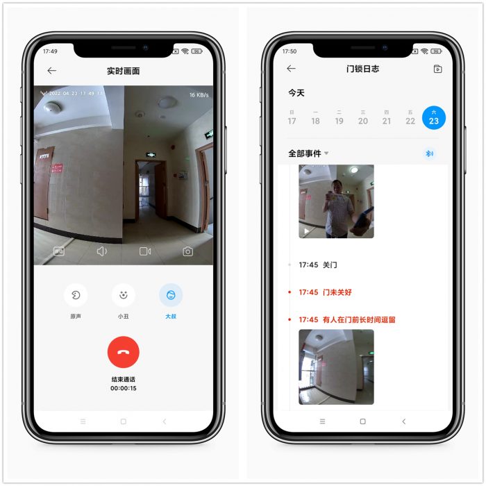 此外智能锁采用是定制的超广角大镜头,监控范围也是非常大的,采用 16 : 16 画面比例,家门口监控视野更大,门前的地面也能看得见,每天保洁阿姨在门口拖地都能拍得清清楚楚,而且人物都能看清全身,不像以前笔者用的那款旧指纹锁只能看见半身,而且画面清晰度也不是很好。