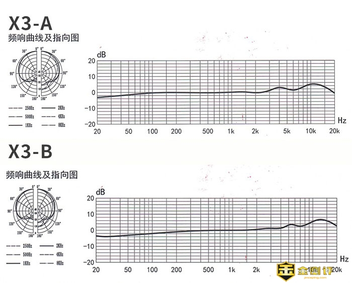 之前说过了,这款X3系列有2个型号,不同的区别在哪呢,从下图的频响曲线可以看到,X3-A的中频部分比X3-B更丰富一些,X3-B的高频比X3-A更突出一些。所以两款麦克风声音特点还是比较明显的,X3-A主打厚重磁性,音色质感。X3-B主打明亮通透、声音温暖。
