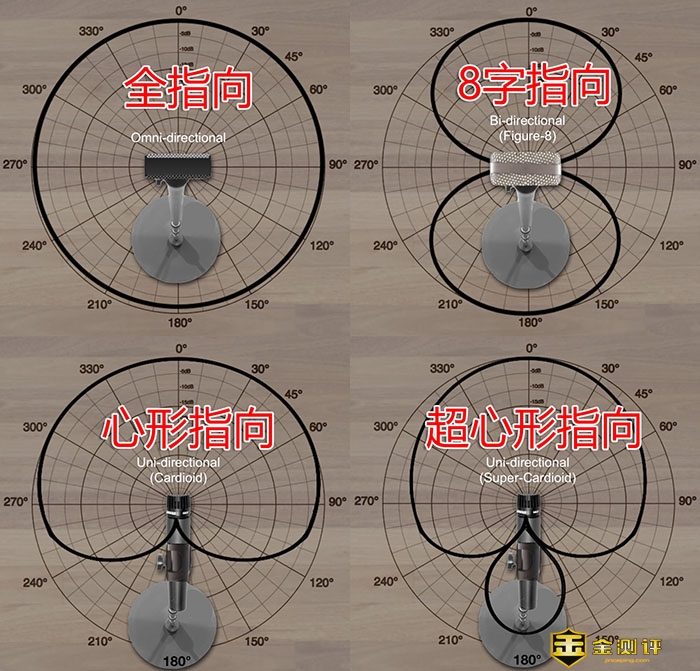 下图中展示了4种麦克风的指向性图示,全指向、心形指向、8字指向和超心形指向。全指向的麦克风,可以收录以麦克风为中心的周围360度的声音;心形指向的麦克风,可以收录以麦克风为中心的正对着麦克风方向的声音;而8字指向麦克风,可以收录以麦克风为中心,正对和背对着麦克风方向的声音。除此之外还有超心形,超指向等。