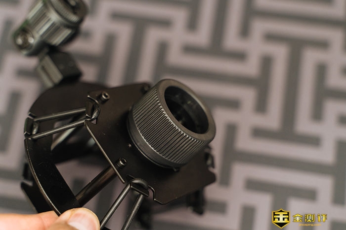 再来看一下防震架,防震架的作用是什么呢,简单的说就是相当于相机的防抖装置,因为电容麦克风灵敏度高,轻微的声音都能被收录到,更别说录音时产生的一些震动,所以这个防震架可以减轻一些震动带来的噪音,让录音的音质更干净。防震架是一个双层结构,内外侧通过橡胶皮筋连接,在一定程度上可以减轻晃动。