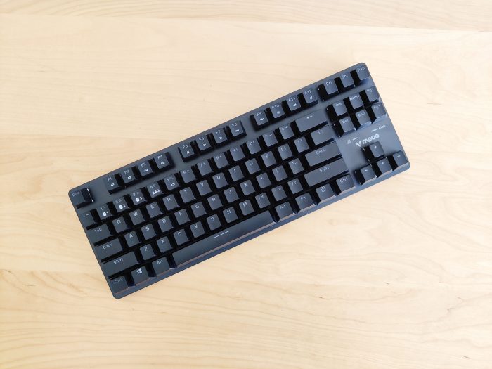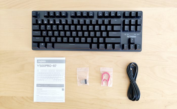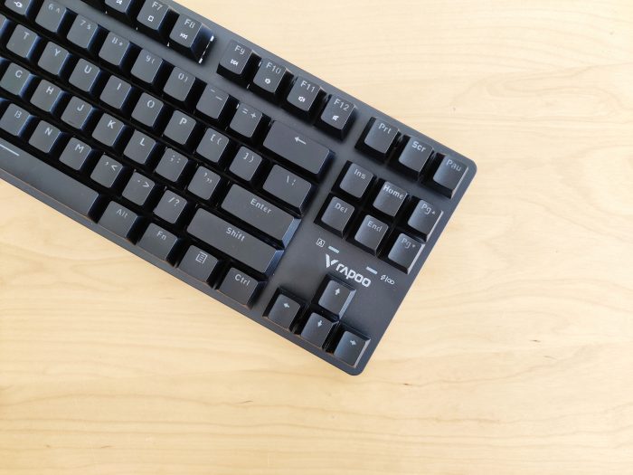 键盘基本采用纯黑的配色,87键设计得比较紧凑,键盘上唯一的点缀就是右下角在上下左右键上方的雷柏logo和指示灯。