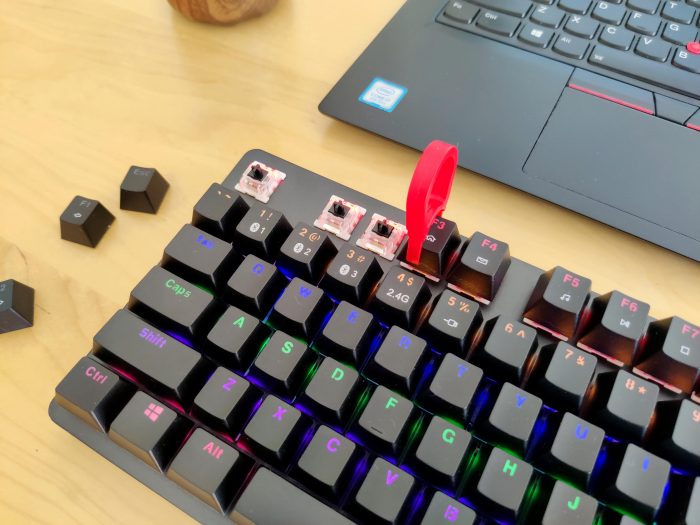 键帽采用了镭雕技术,摸上去有一种细颗粒的磨砂感,手感不错,而且不容易留下指纹。键帽上的字符采用激光雕刻,不用担心长时间使用会抹掉,而且摸上去很平整。当然,如果想diy自己的键盘,那么随时更换键帽都是可以的,随键盘赠送拔键器这一点就很贴心。