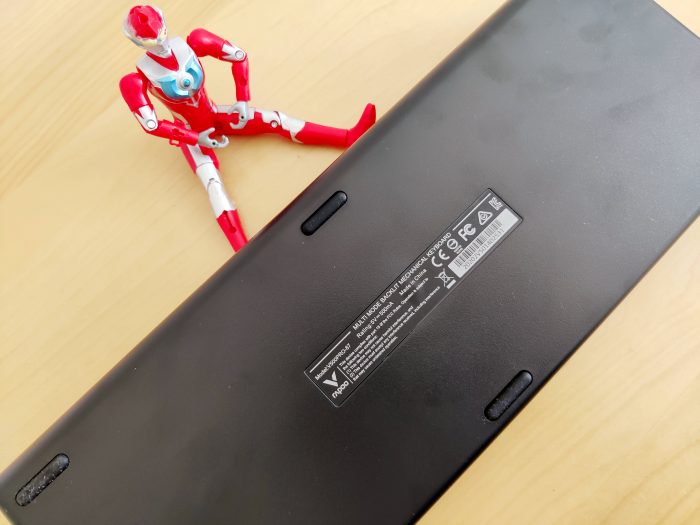 键盘的背面有六个防滑垫,放在桌子上非常稳固,不易滑动,中间还有型号信息。