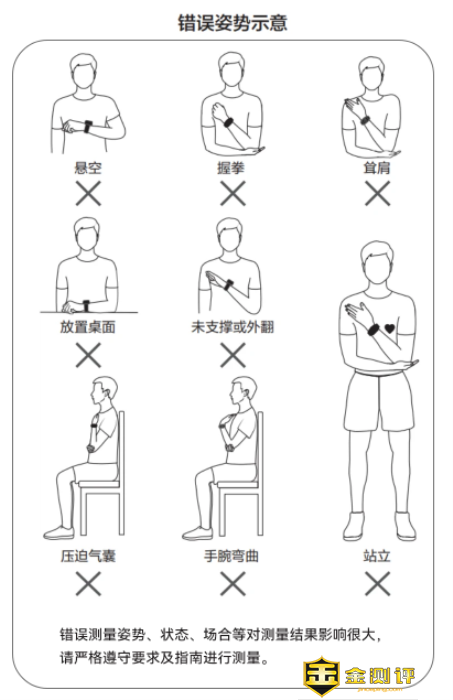 例图里展示错误的姿势和动作,不标准的动作姿势以及不充分的准备状态会让测量结果出现误差或者错误。