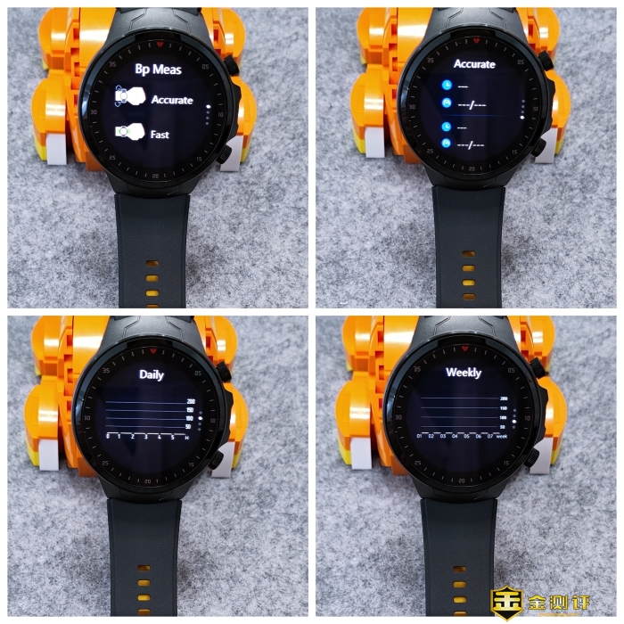 按压下侧键,会直接进入血压监测快捷菜单,包括快速检测和精准检测模式选择、日报表、周报表以及数据展示等。