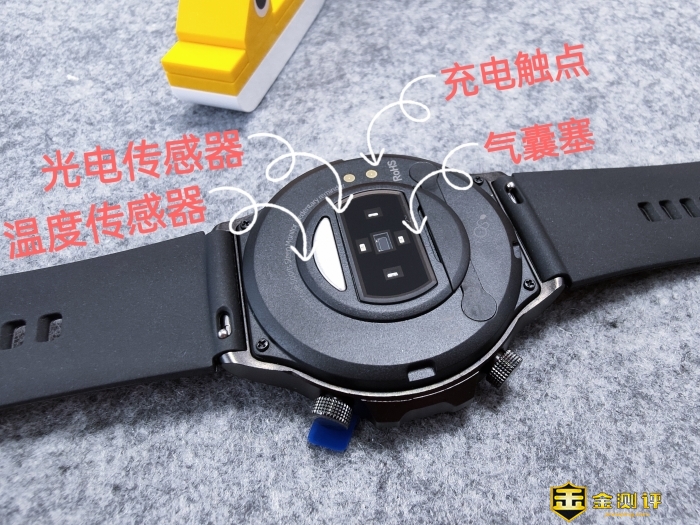 撕掉保护可以看到高透材质的光电传感器,上下分别是温度传感器和气囊塞,右边有2个金属触点,是用来充电用的。
