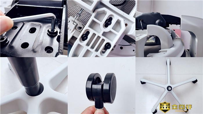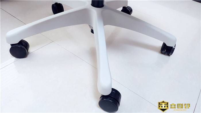 底座设计为高强度尼龙五星脚,静态称重可搭1136KG,360°旋转万向轮,转起来几乎没什么声音,耐磨与防滑性能也很不错。