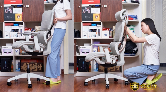 从上面的细致对比可以看出,上半部分靠背在后仰过程中内陷,压缩了与椅背X的间距(绿色指示);下半部分靠背随后仰逐渐下沉,并且收束自身与坐垫之间的夹角,紧紧“咬住”腰部不松开(橙色指示);上半部分与下半部分之间也确实伴随后仰拉大了间距,再次说明XY椅靠背的上下部分是各自独立的(红色指示)。