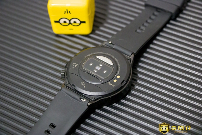 由于很多测量传感器都设计在手表的背面,电子元器件布局有些复杂,除了充电触点和中间光电传感器之外,还有一个温度传感器,用于测量用户的体温;而另一侧有个半圆气囊塞,内部隐藏有连接气囊的接口,测量血压的时候气囊通过此处连接。