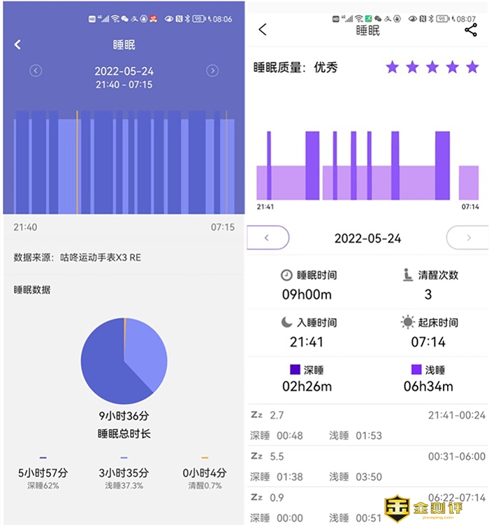 睡眠情况也能通过智能手表进行监视,两款手表对于睡眠时间的计算基本一致,差别在于深睡和浅睡的累积时长有些不同,可能对于判定深浅睡眠的指标不同,至于那个更准确,暂时无法界定。