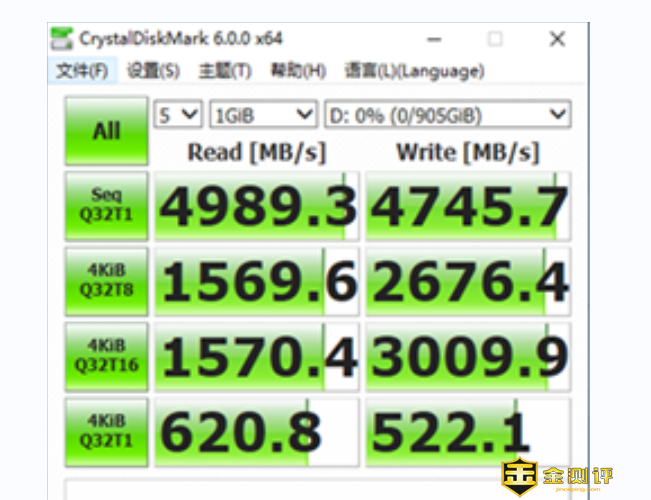 通过CrystalDiskMark进行读写速度测试,大华C970固态硬盘读取速度为4989MB/s,写入速度为4745MB/s,非常接近官方宣传的读写速度5000MB/s和4700MB/s。