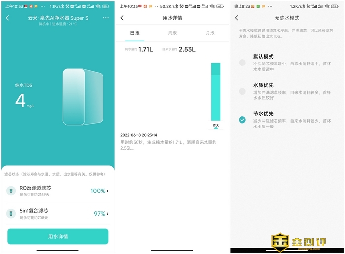 最基本的,通过APP可以实时查看进水温度和水质。经对比,数据显示延迟非常低哦。基本上水龙头的智能屏显一变化,手机端就紧跟着在变。APP上显示RO反渗透滤芯剩余可用2169天、5in1复合滤芯可用708天,以这种耐用程度折合下来,云米泉先Super S 1200G净水器的每日使用成本不足2角钱。