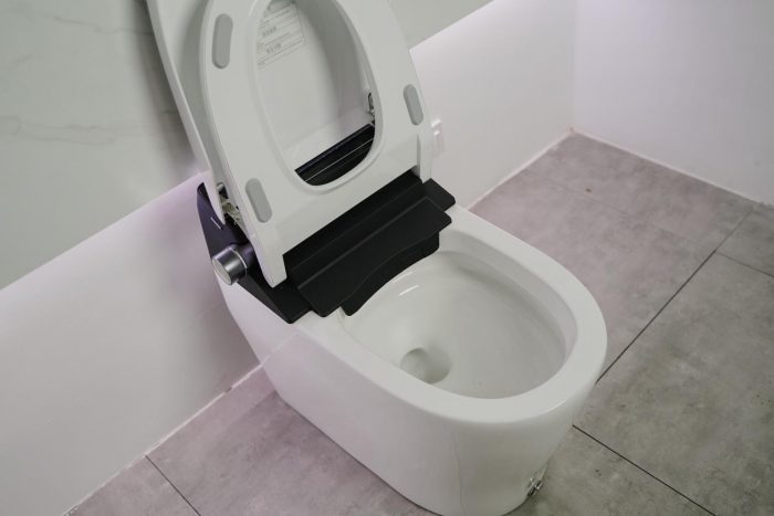这是云米AI健康检测马桶Air打开盖板和座圈后的样子,支持自动翻盖翻圈哦,这个功能你喜欢吗?可以看到盖板和座圈下都设计有缓震橡胶垫,落座稳固的同时,缓降合盖时声音也会更安静。