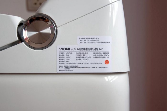 参数标示贴粘贴在马桶的机身侧面,在这里我们可以看到产品名称、型号、加热方式、防水等级等参数,它的防水等级为IPX4级,可以保障在潮湿环境中的安全使用,但不能用水直接冲洗坐便器和遥控器。另外,云米AI健康检测马桶Air的马桶盖是支持单独拆卸的,日常清理维护更方便。