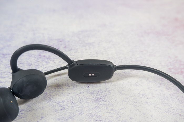 南卡骨传导Runner Comm蓝牙耳机右边的2个金属触点,是用来充电的,由于没有常见的充电接口,所以可以采用一体化成型技术,表面还有纳米级防水涂层,使得南卡骨传导Runner Comm蓝牙耳机的防水等级达到了IPX6级。