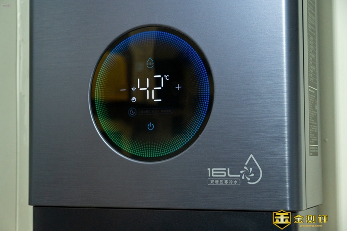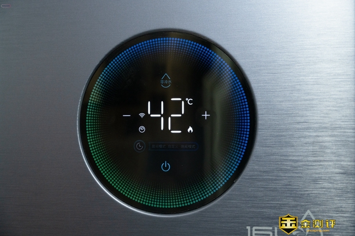 在这块区域,我们可以查看热水器的基本状态,像是加热温度,还有零冷水、涡轮增压等功能的状态,都可以直接通过上门的触控按键进行设置,结果也是所见即所得的。另外可以看到,这款热水器还有一个预约功能,可以选择三个时段,到时间热水器会自动预热,减少我们等待的时间,这一点是很多同类产品不具备的功能。