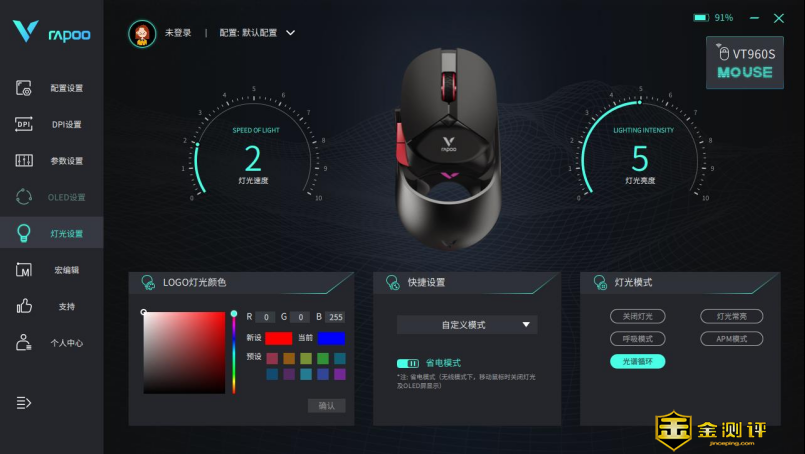 雷柏VT960S鼠标的信仰灯具有1680万色全彩RGB灯光,并提供了全亮、循环、呼吸、APM等四组风格的灯光效果。鼠标的光线并没有采用刺激的强光,而是悠悠淡光让鼠标在夜间给人舒适典雅的氛围。