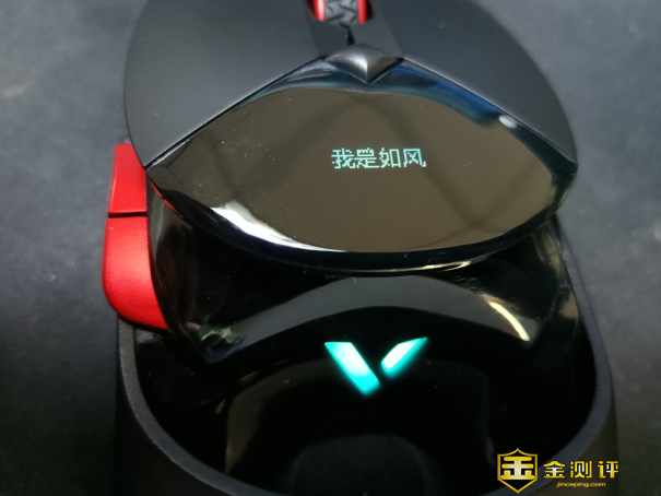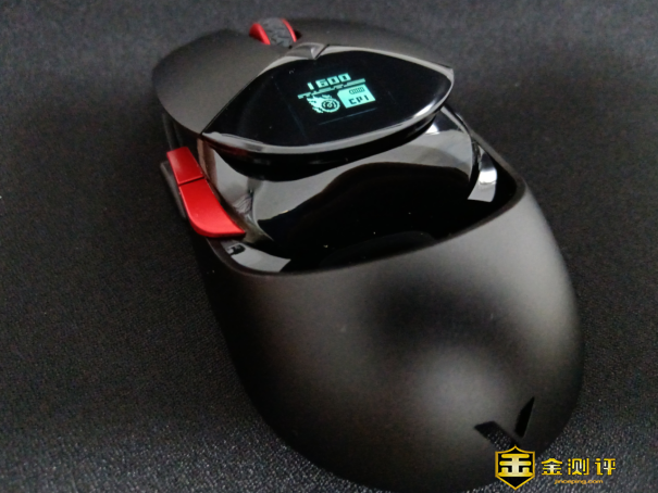 鼠标正面采用了黑色的磨砂质感材质,手感顺滑,手托部位使用弧线造型,符合人体工程学设计,给手掌以贴合的支撑,最为特别的就是在按键下面放置了一块客制化0.66英寸的点阵显示屏,分辨率为64*68为,显示内容可以进行自定义,不仅可以鼠标的参数还能显示文字、图片等信息。屏幕下面放置了一枚RGB信仰灯,两侧侧裙均设置有防滑的磨砂纹路,大大的增加了摩擦力防止使用中的打滑现象。