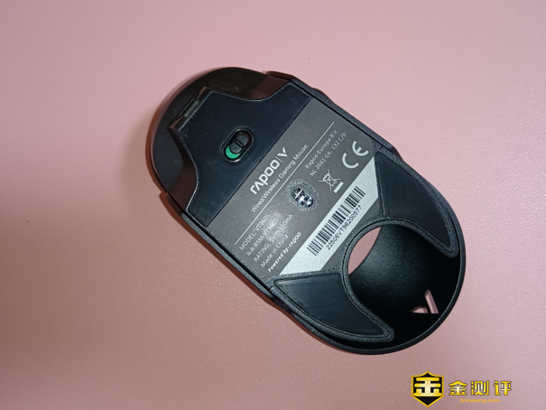 雷柏VT960S鼠标底部印有产品的品牌、型号以及多种的认证标识,两端分别放置了特氟龙材质脚贴,上方放置了拨动开关,中间位置为传感器。