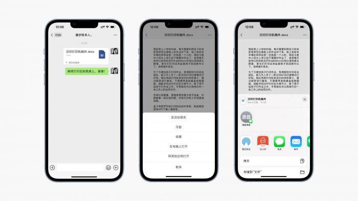 除了在APP中加载文件打印之外,还可以在社交软件中直接调取打印功能,支持微信、QQ、钉钉等主流软件。以iPhone为例,微信上有同事或者老师发来文件,打开文件预览后选择“用其他应用打开”,再点击“汉小印”就可以直接跳转到打印界面,无需将文件先保存到手机,尤其是iPhone文件管理不是特别方便。
